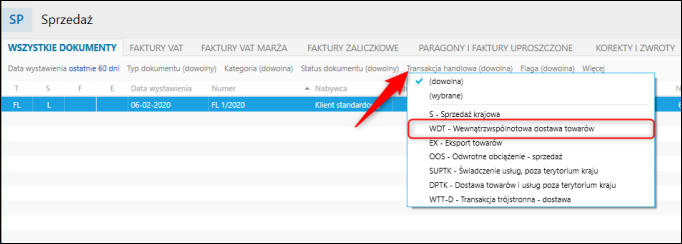Aby filtrować dokumenty po typie transakcji handlowej na liście dokumentów sprzedaży, należy: