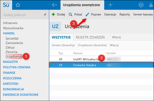 1. Przejść do modułu Urządzenia, zaznaczyć odpowiednią drukarkę fiskalną i kliknąć górne menu Popraw.
