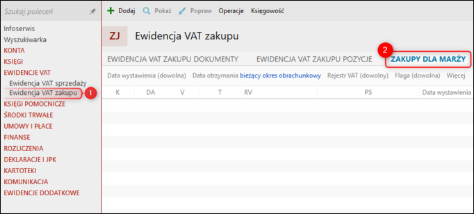 1. Przejść do modułu Ewidencje VAT – Ewidencja VAT zakupu i przejść na zakładkę Zakup marża.