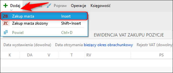 2. Wybrać z górnego menu Dodaj – Zakup marża.