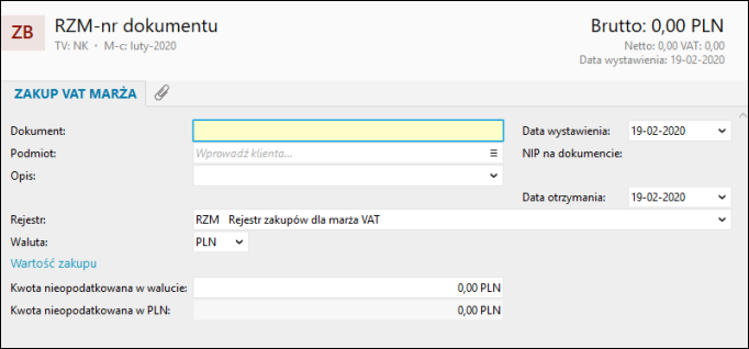 ​​System InsERT nexo umożliwia w kontekście widoku Zakup marża dodawać zapisy reprezentujące zakupy w systemie rozliczenia VAT marża. Aby dodać zapis dla FZ VAT marża, należy: