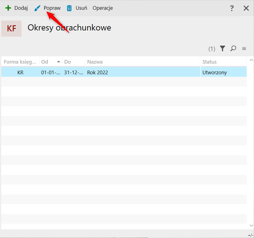 1. Przejść do modułu Ewidencje dodatkowe – Konfiguracja i wybrać Okresy obrachunkowe, a następnie Popraw, mając zaznaczony okres obrachunkowy.