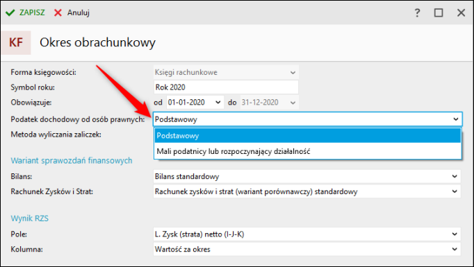 2. Wybrać z listy rozwijanej podatek dochodowy od osób prawnych.