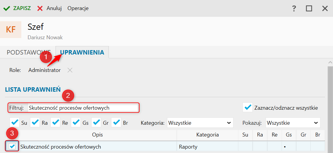 2. Przejść na zakładkę Uprawnienia, w Filtruj wpisać Skuteczność procesów ofertowych, a następnie odznaczyć znacznik przy wybranym uprawnieniu. Zmiany zatwierdzić przyciskiem Zapisz.