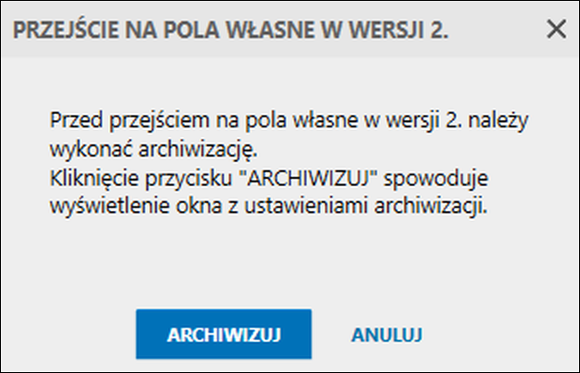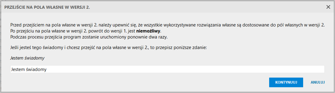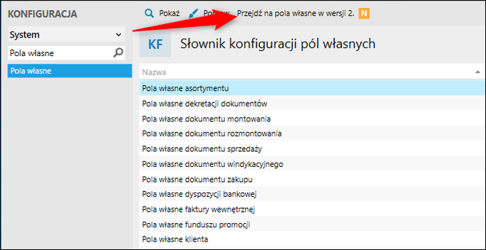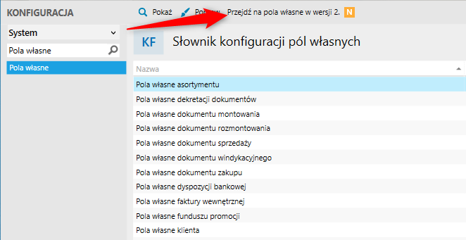 Aby uruchomić proces migracji, należy przejść do modułu Konfiguracja, a następnie wybrać Pola własne – Przejdź na pola własne w wersji 2.
