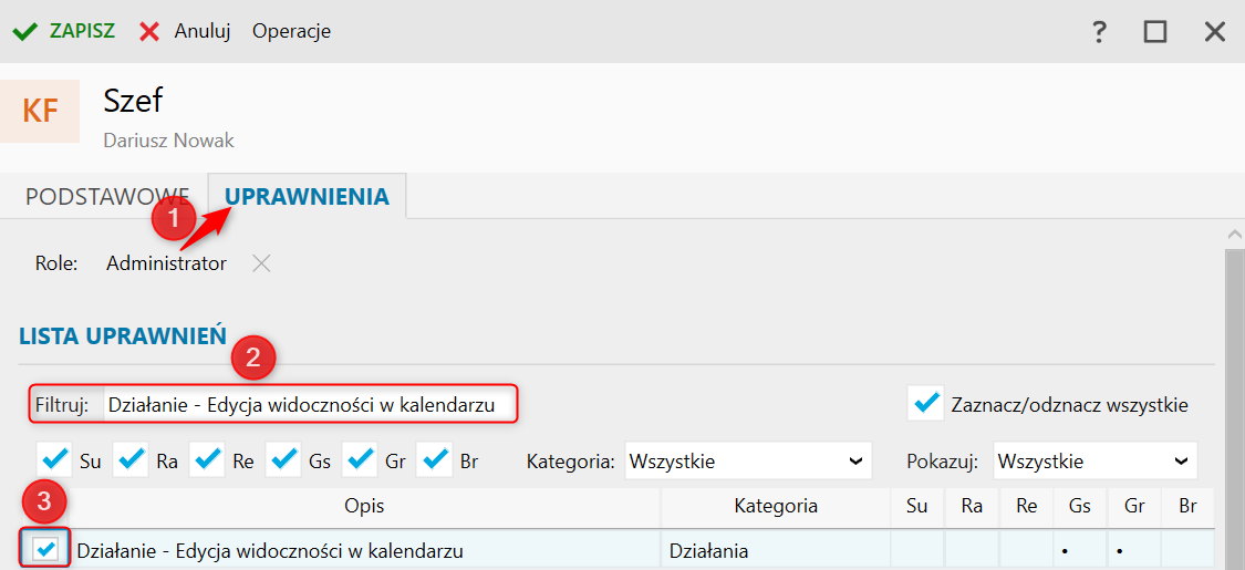2. Przejść na zakładkę Uprawnienia, w Filtruj wpisać Działanie – Edycja widoczności w kalendarzu, a następnie odznaczyć znacznik przy wybranym uprawnieniu. Zmiany zatwierdzić przyciskiem Zapisz.