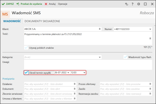 Wiadomości SMS umożliwiają odłożenie wysyłki wiadomości na wybrany przez użytkownika termin. Aby zaplanować wysyłkę w późniejszym terminie, należy w oknie wiadomości zaznaczyć opcję Określ termin wysyłki, a następnie wprowadzić zaplanowaną datę i godzinę.