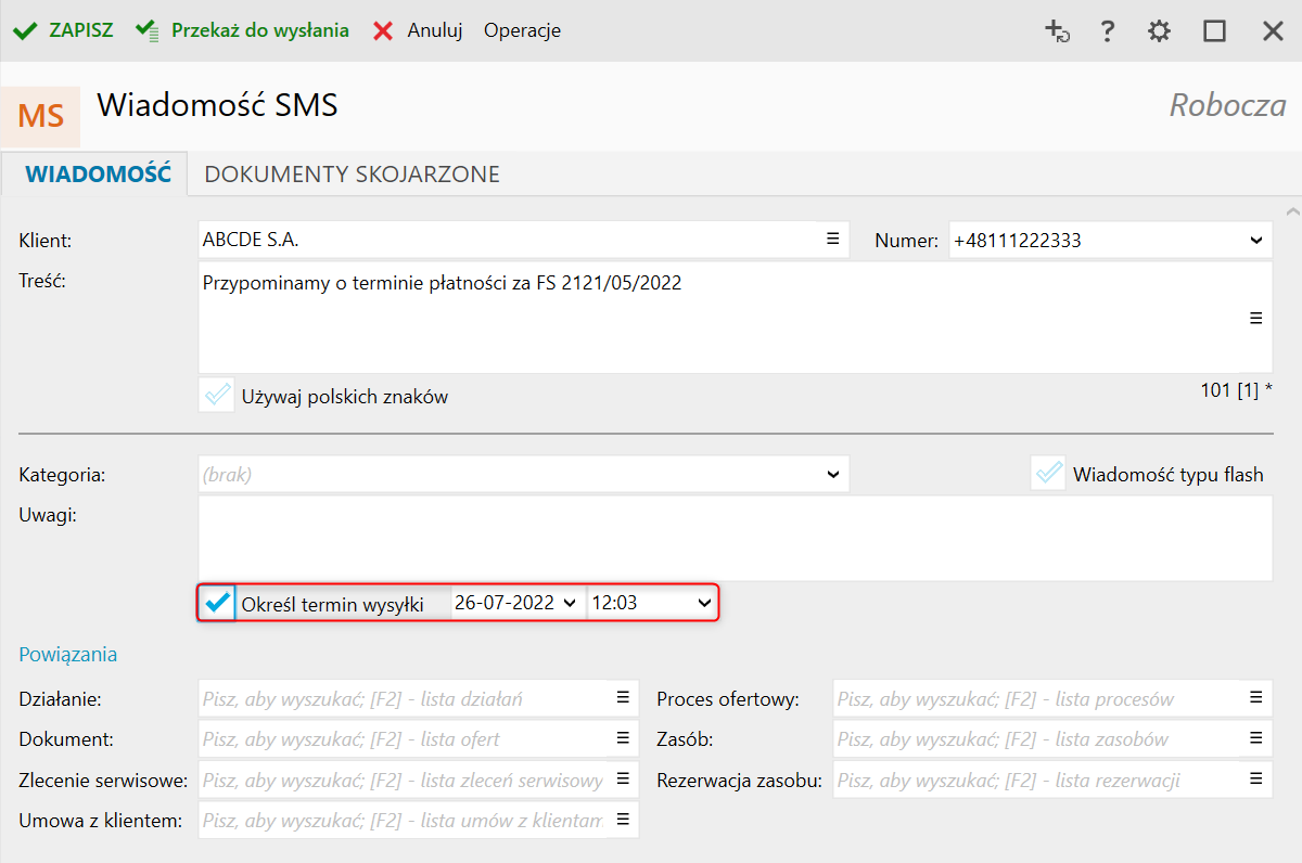 Wiadomości SMS umożliwiają odłożenie wysyłki wiadomości na wybrany przez użytkownika termin. Aby zaplanować wysyłkę w późniejszym terminie, należy w oknie wiadomości zaznaczyć opcję Określ termin wysyłki, a następnie wprowadzić zaplanowaną datę i godzinę.