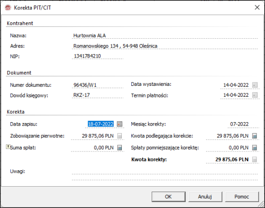 2. Jeżeli nie następuje żadna zmiana danych korekty, zapisać przyciskiem OK.