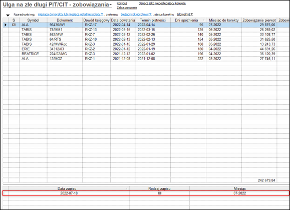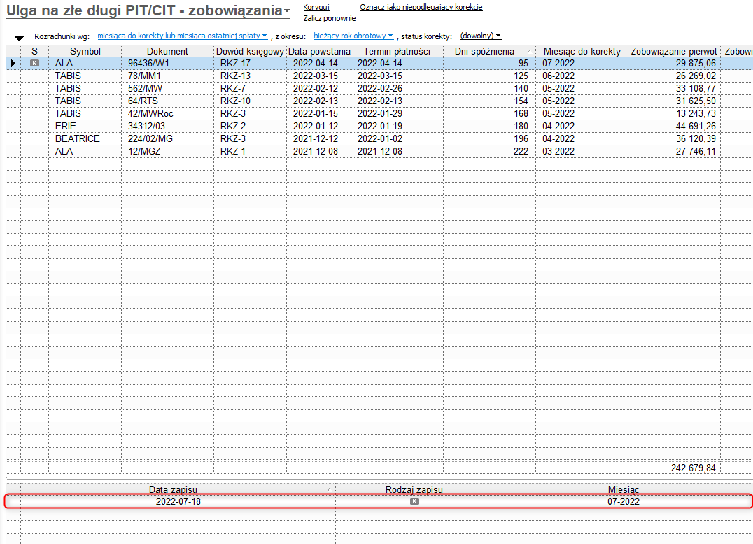 1. Przejść do modułu Ewidencje pomocnicze – Ulga na złe długi PIT/CIT - zobowiązania, zaznaczyć odpowiedni rozrachunek i kliknąć Koryguj.