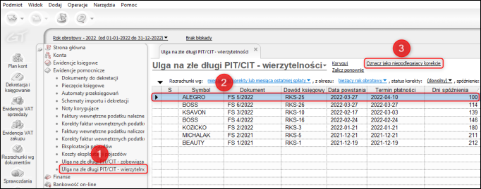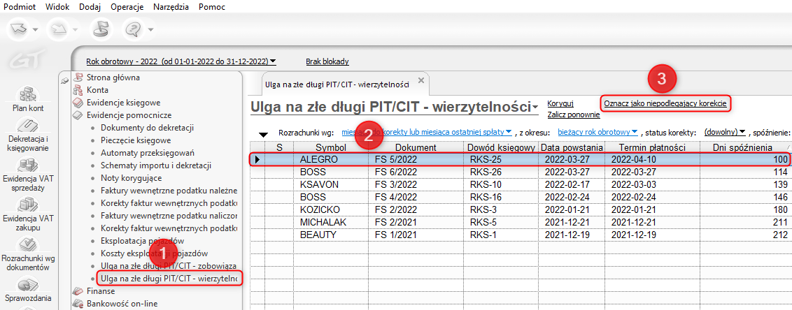 1. Przejść do modułu Ewidencje pomocnicze – Ulga na złe długi PIT/CIT – wierzytelności, zaznaczyć odpowiedni rozrachunek i kliknąć Oznacz jako niepodlegający korekcie.