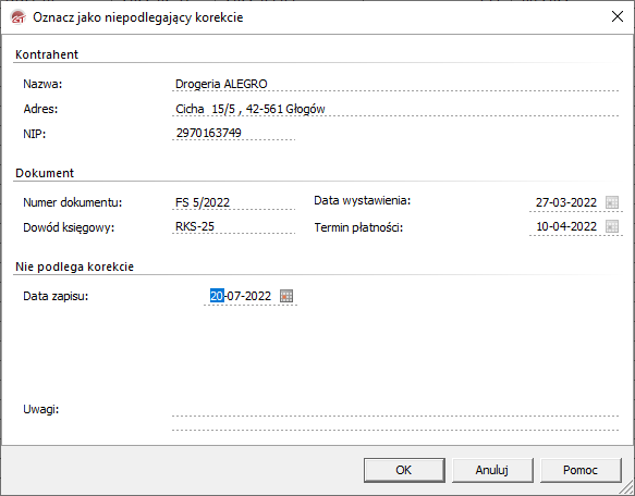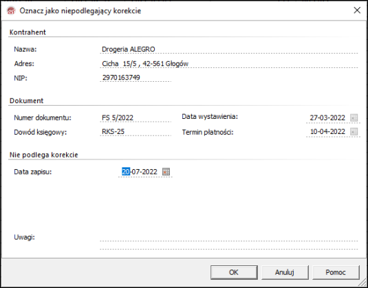 Aby oznaczyć należność (złe długi) jako niepodlegającą korekcie w module Ulgi na złe długi PIT/CIT – wierzytelności, należy: