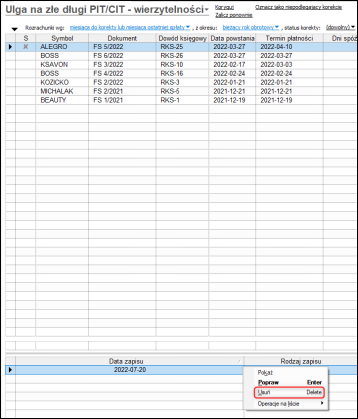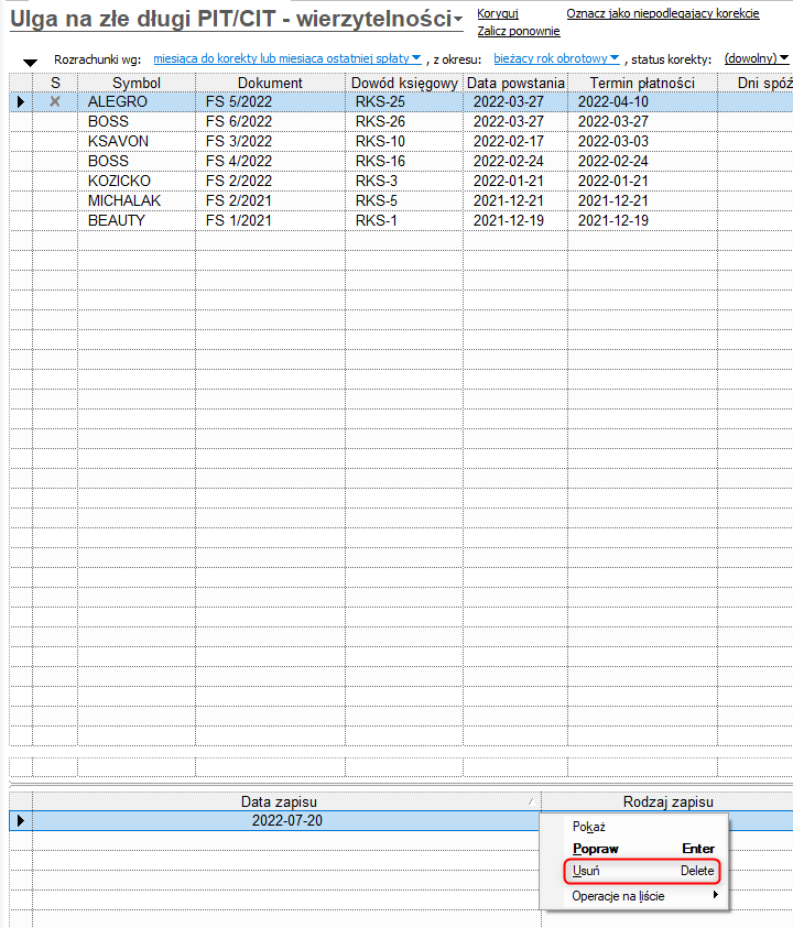 3. Oznaczenie rozrachunku w ten sposób zablokuje możliwość wykorzystania go do korekty. Aby wycofać oznaczenie, należy usunąć operację w dolnej części modułu, klikając na pozycję prawym przyciskiem myszy.