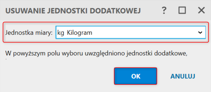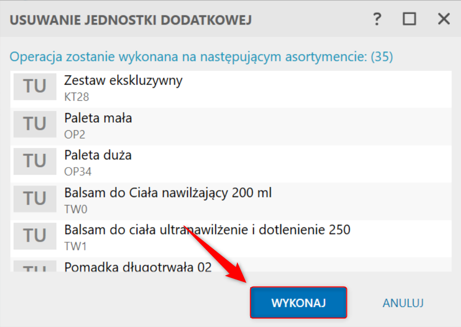 3. Usunięcie dodatkowej jednostki miary zatwierdzić przyciskiem Wykonaj.