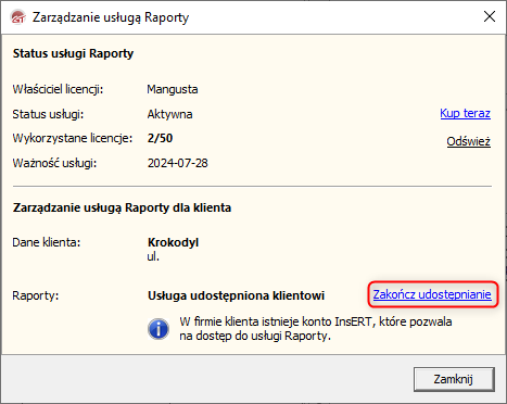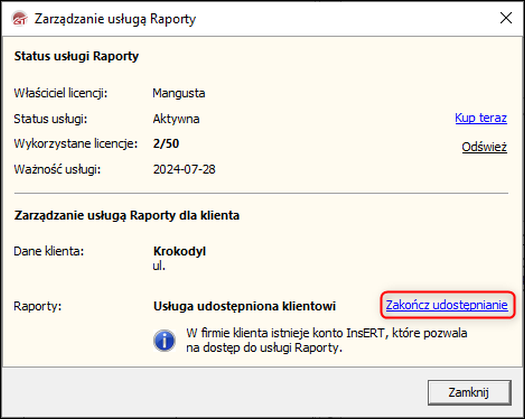 InsERT GT – Jak zakończyć udostępnianie klientowi usługi Raporty?