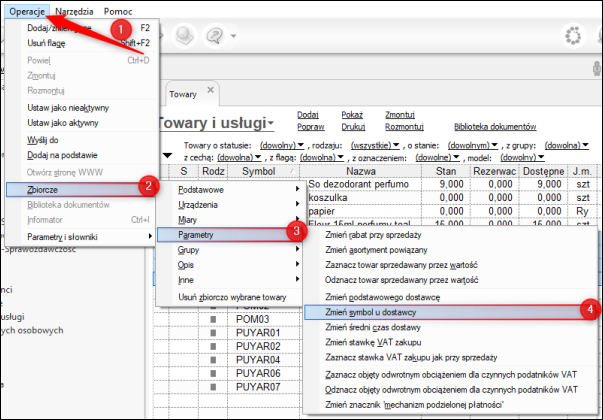 2. Wybrać z górnego menu Operacje – Zbiorcze – Parametry – Zmień symbol u dostawcy.