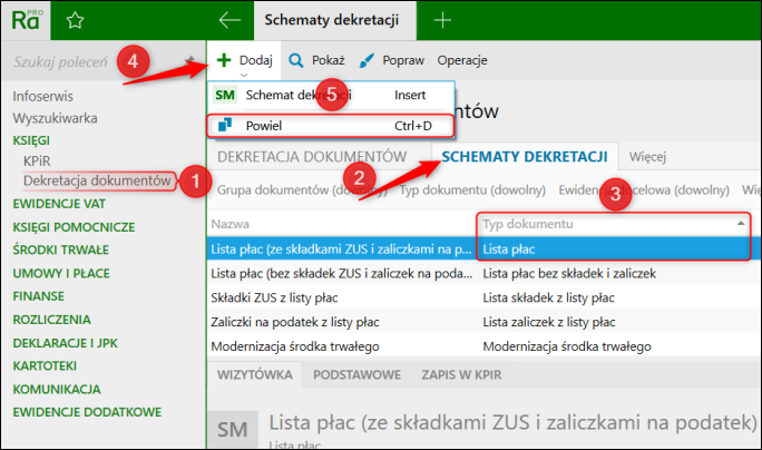 1. Przejść do modułu Dekretacja dokumentów, następnie na zakładkę Schematy dekretacji, odnaleźć schemat dekretacji dotyczący Listy płac i kliknąć górne menu Dodaj ​ Powiel.