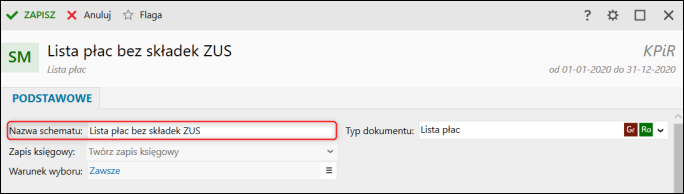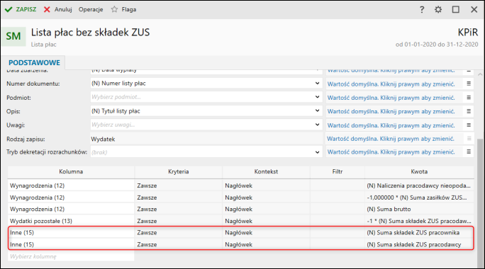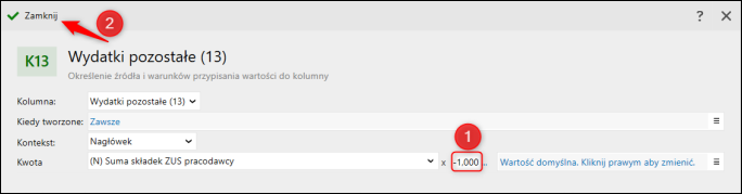 4. Kwota (N) Suma składek ZUS pracodawcy powinna być pomnożona x (-1). Po wprowadzeniu zmian Zamknąć okno.