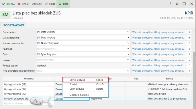 3. Kliknąć prawym przyciskiem myszy na pozycję związaną z Sumą składek ZUS pracodawcy, następnie Edytuj pozycje.