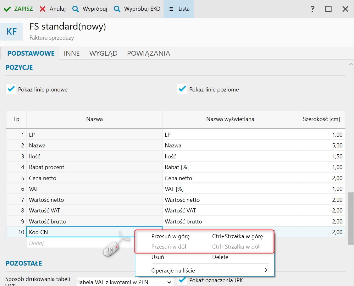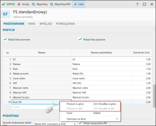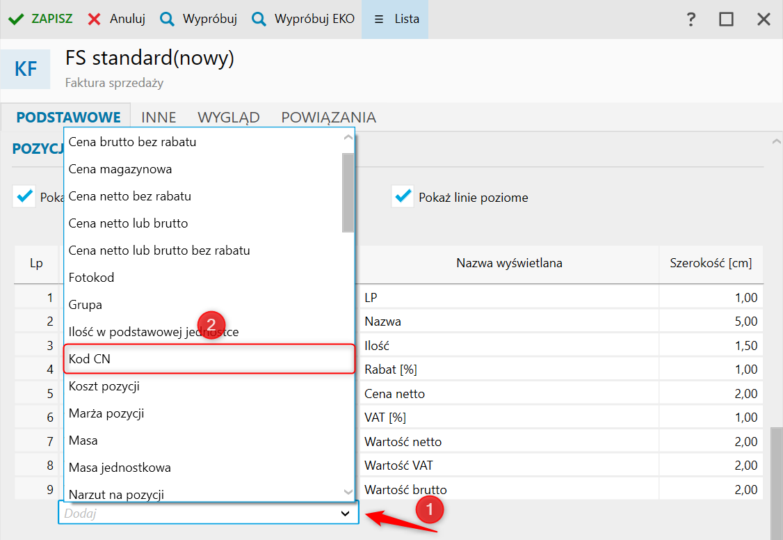 2. W sekcji Pozycje rozwinąć listę dostępnych kolumn i wybrać kolumnę – Kod CN.