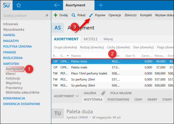 1. Przejść do modułu Asortyment, zaznaczyć towar, następnie kliknąć górne menu Popraw.