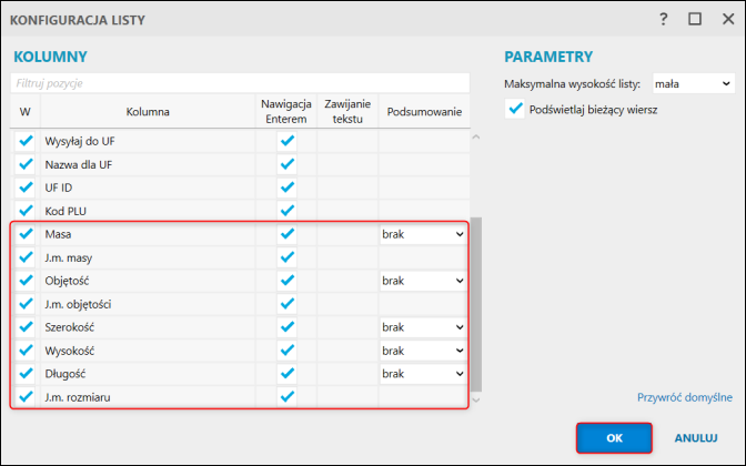 3. Włączyć wybrane kolumny i przycisk OK zapisze zmiany.