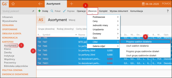 1. Z listy modułów wybrać Kartoteki – Asortyment, zaznaczyć kartoteki, którym zostanie przypisany szablon działania i z górnego menu wybrać Zbiorczo – CRM – Przypisz szablon działania.