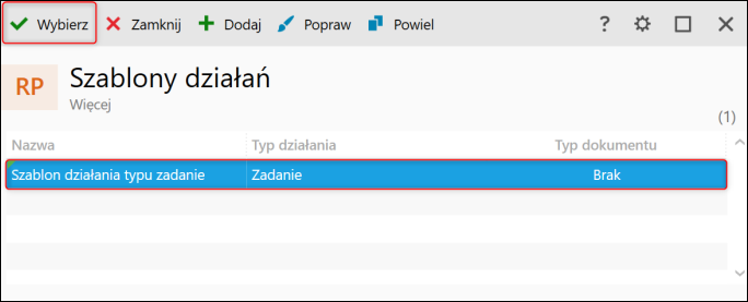 2. W oknie, które się wyświetli zaznaczyć szablon działania, który zostanie przypisany do zaznaczonych wcześniej kartotek i następnie kliknąć przycisk Wybierz.