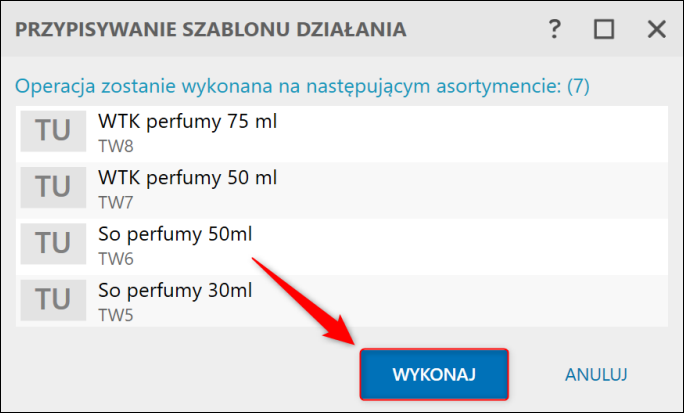 3. Operację przypisania szablonu działania do zaznaczonych wcześniej kartotek zatwierdzić przyciskiem Wykonaj.