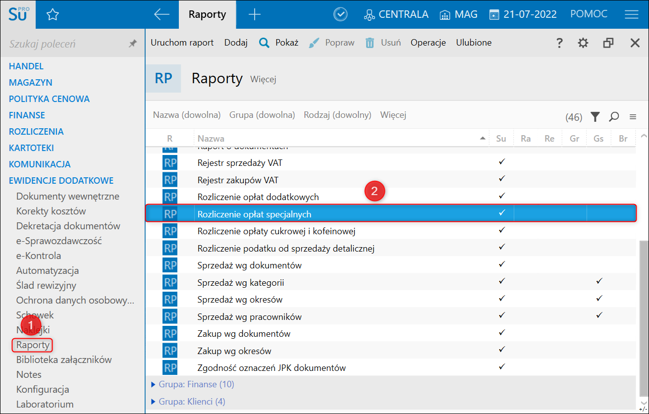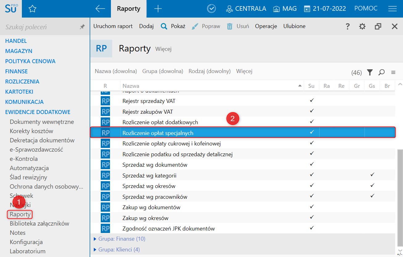 1. Przejść do modułu Ewidencje dodatkowe  Raporty i wybrać Rozliczenie opłat specjalnych.