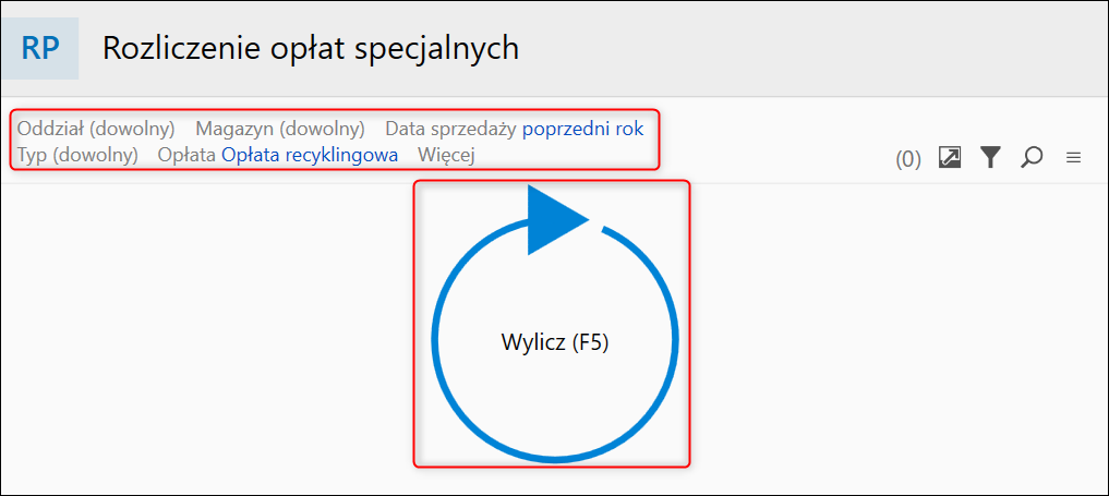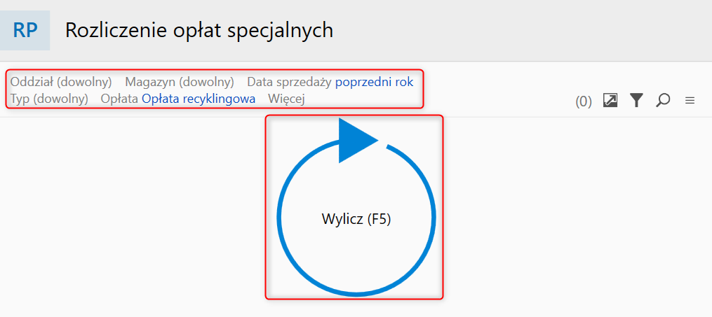 2. Filtr Opłat​a ustawić na Opłata recyklingowa pozostałe filtry ustawić według​ własnej specyfiki pracy, następnie kliknąć Wylicz.