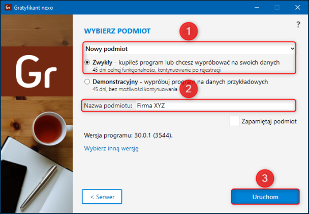 Po uruchomieniu oprogramowania z listy wyboru należy kliknąć na Nowy Podmiot. Automatycznie pojawi się pole Nazwa podmiotu możliwa do wypełnienia. Zaznaczenie Zwykły pozwoli wprowadzić własne dane. Po 45 dniach można zarejestrować go bez utraty danych. Zaznaczenie Zapamiętaj podmiot spowoduje, że przy każdym uruchomieniu programu automatycznie będzie przechodził do tej bazy danych. Po kliknięciu Uruchom program przejdzie do kreatora wdrożeniowego.