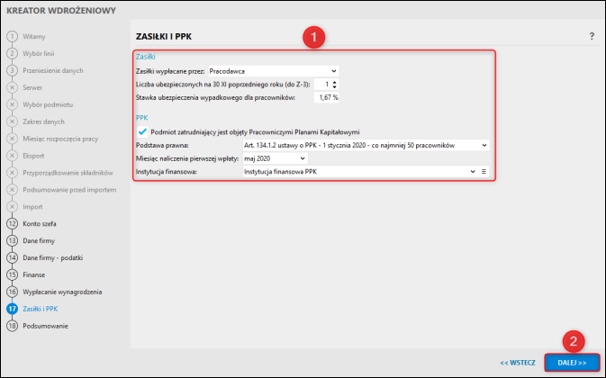 9. Sekcja Zasiłki służy do określenia kto jest płatnikiem zasiłków, jak również wprowadzenia liczby ubezpieczonych i stawki ubezpieczenia wypadkowego. Jeśli przedsiębiorstwo korzysta z Pracowniczych Planów Kapitałowych należy zaznaczyć znacznik Podmiot zatrudniający objęty jest Pracowniczymi Planami Kapitałowymi i wybrać Podstawę prawną, Miesiąc naliczenia pierwszej wpłaty oraz Instytucję finansową, do której przekazywane będą wpłaty.