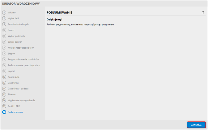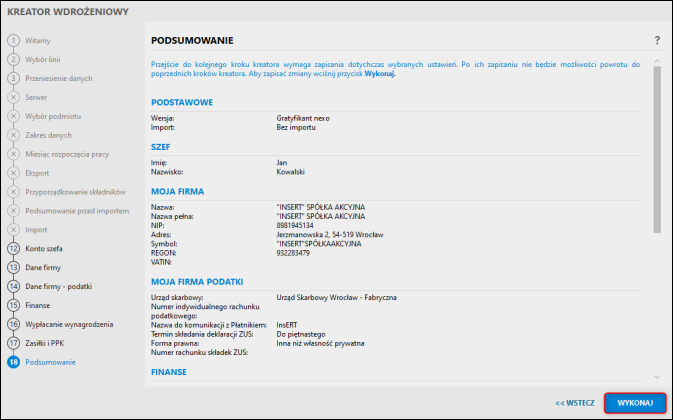 UWAGA!! Należy pamiętać, że po kliknięciu przycisku Wykonaj nie będzie można już powrócić do kreatora wdrożeniowego, przez co niektóre z wcześniej wybranych opcji nie będą mogły zostać później zmienione.