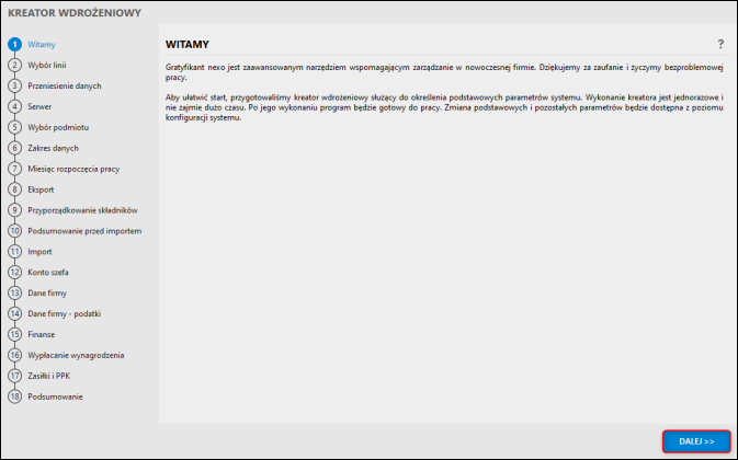 1. Zapoznać się z treścią ekranu powitalnego i kliknąć Dalej.