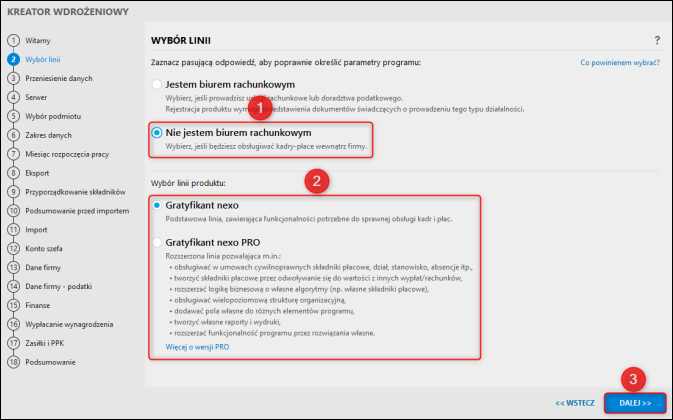 2. Zaznaczyć Nie jestem biurem rachunkowym, następnie wybrać odpowiednią wersję i kliknąć przycisk Dalej.
