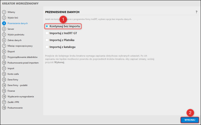 3. Wybrać Kontynuuj bez importu i kliknąć Wykonaj.