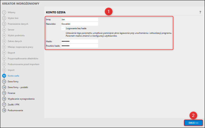 4. Wpisać Imię i Nazwisko głównego użytkownika, który będzie miał najwyższe uprawnienia na tym podmiocie i hasło do niego. Można również zaznaczyć znacznik Logowanie bez hasła, co (tylko w przypadku jednego użytkownika stworzonego na danym podmiocie) umożliwi logowanie i konwersję bazy danych bez uwierzytelniania. Po uzupełnieniu wszystkich wymaganych danych, należy kliknąć przycisk Dalej.