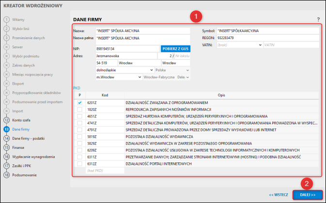 5. Uzupełnić dane adresowe firmy i kliknąć Dalej.