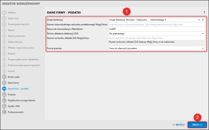6. Wpisać dane podatkowe, tj. wybrać Urząd skarbowy, wpisać nazwę do komunikacji z programem Płatnik, wpisać Termin składania deklaracji ZUS, wybrać Formę prawną, dodać Numer rachunku składek ZUS, wybrać Jednostkę nadrzędną dla rozliczeń VAT (Wszystkie pola są opcjonalne) i kliknąć przycisk Dalej.