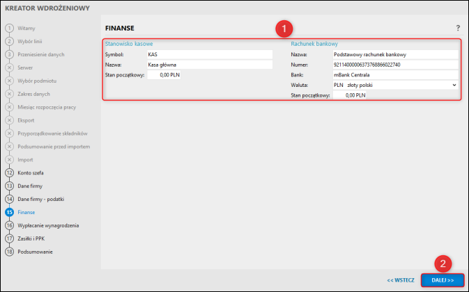 7. Uzupełnić dane kasy i rachunku bankowego, po czym kliknąć Dalej.