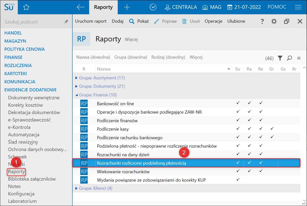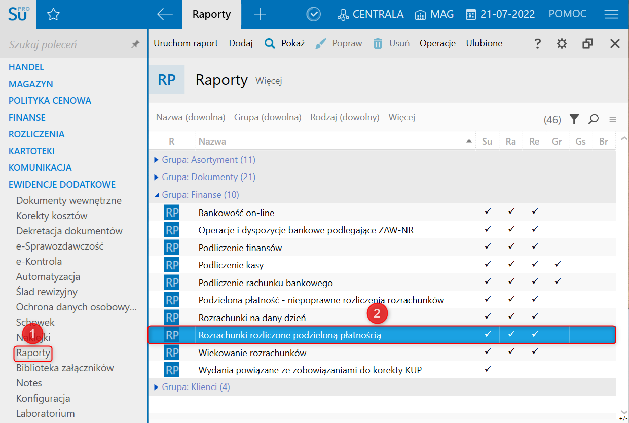 1. Przejść do modułu Ewidencje dodatkowe – Raporty i wybrać Rozrachunki rozliczone podzieloną płatnością.