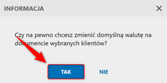 3. Operację zmiany domyślnej waluty na dokumentach sprzedaży zaznaczonym wcześniej klientom zatwierdzić przyciskiem Tak.