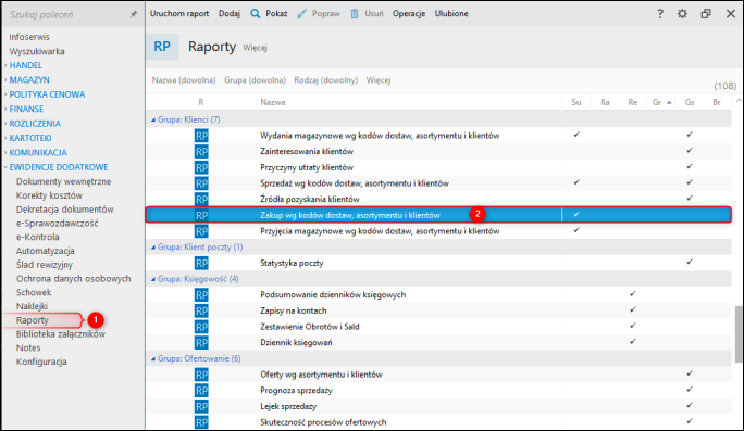 1. Przejść do modułu Ewidencje dodatkowe  Raporty i wybrać Zakup wg kodów dostaw, asortymentu i klientów.