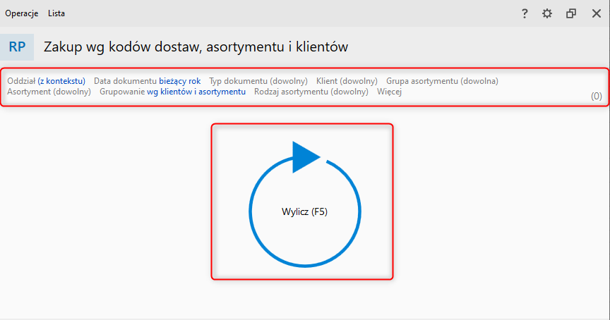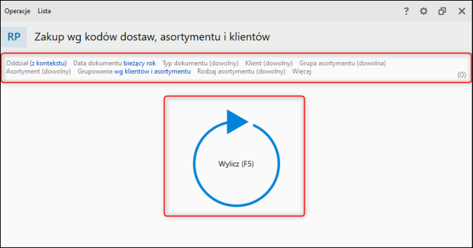 Aby wyliczyć raport prezentujący zakup według kodów dostaw, asortymentu i klientów (z wartością netto, brutto i kosztem), należy: