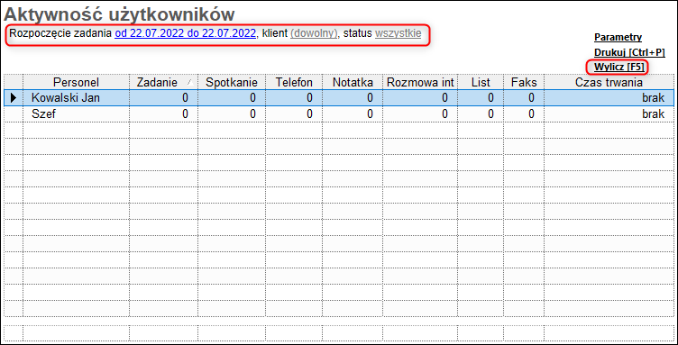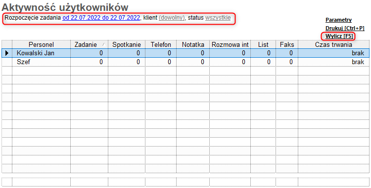 Aby wyliczyć zestawienie prezentujące aktywność użytkowników (jest to zestawienie współdzielone z Gestorem, które przedstawia ilość wykonanych zadań, spotkań, telefonów, notatek, rozmów, listów i faksów w wybranym okresie), należy: