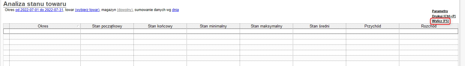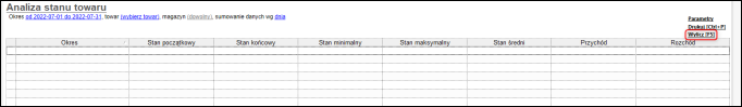 Aby wyliczyć zestawienie prezentujące analizę stanu towaru (stan początkowy, stan końcowy, stan średni, przychód i rozchód we wskazanym okresie), należy: