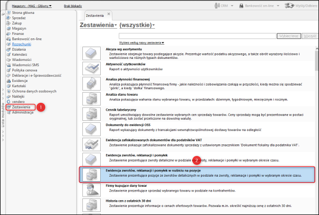 1. Przejść do modułu Zestawienia i wybrać pozycję Ewidencja zwrotów, reklamacji i pomyłek.
