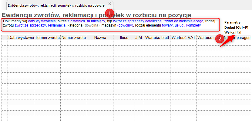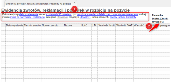 Aby wyliczyć zestawienie prezentujące ewidencję zwrotów, reklamacji i pomyłek (z przyczyną, wartościami netto i brutto oraz dokumentem, do którego dokonano zwrotu), należy: