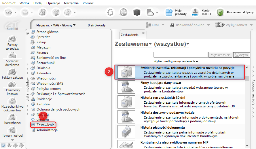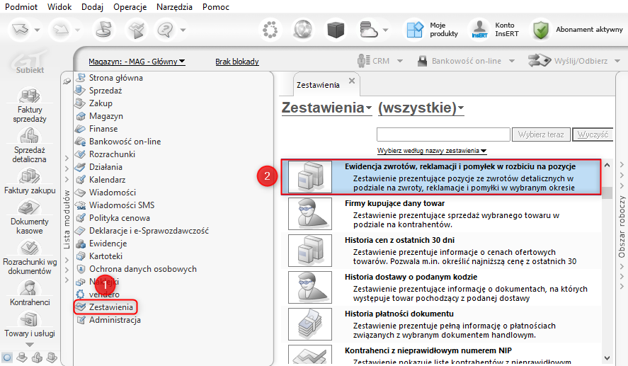 Subiekt GT – Jak wyliczyć zestawienie prezentujące ewidencję zwrotów, reklamacji i pomyłek w rozbiciu na pozycje?
